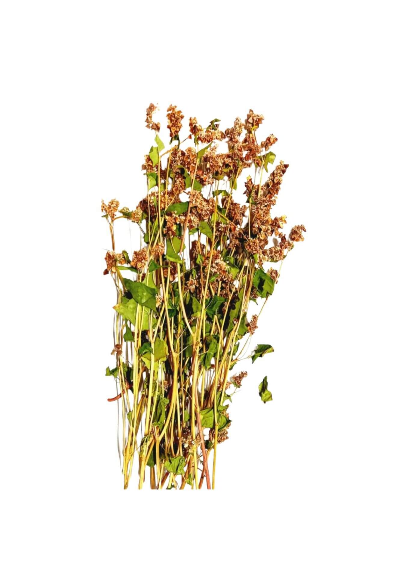 Eine wahre Knusperfreude unser Buchweizen-Büschel…satt grüne Blätter (kann mit der Zeit farbliche Abweichungen geben, da man Buchweizen zu unterschiedlichen Zeiten erntet), weisse Blüten und knackige kleine braune Hülsen in der sich das getreidefreie Buchweizennüsschen versteckt.