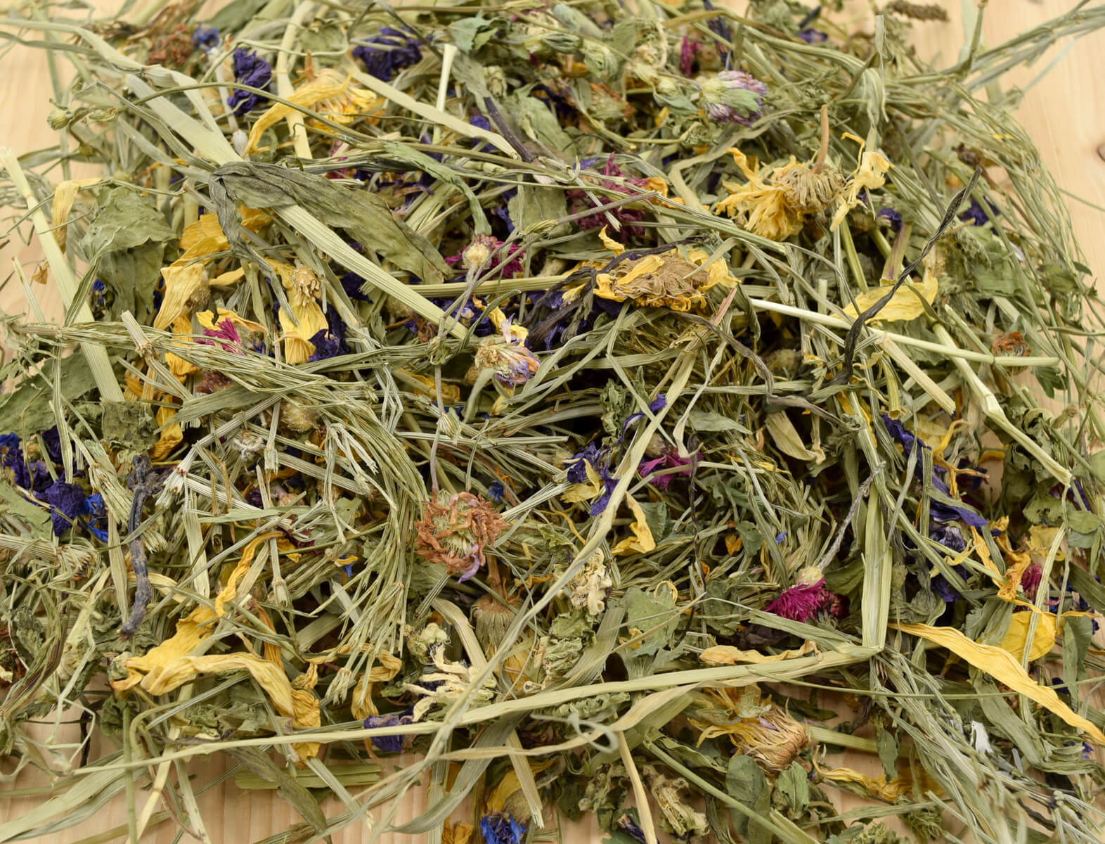 Grüner Hafer und Gerste, Ringelblumenblüten, Ackerschachtelhalm, Kornblumen rot und blau, Malvenblüten blau, Spitz- und Breitwegerich, Taubnessel und Sonnenblumenblütenblätter
